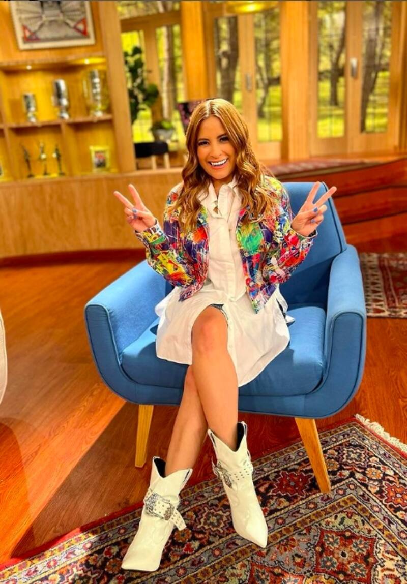 Siempre con una gran sonrisa, Linet lució hermosa con una camisa blanca que combinó perfectamente bien con un short de mezclilla azul y una loca chamarra de colores acompañada de botas vaqueras blancas que están muy en tendencia.