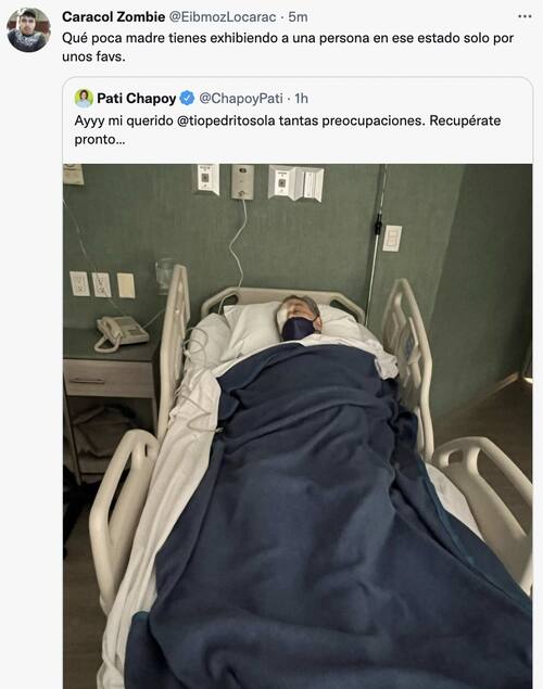 Pedrito Sola preocupó a los usuarios de Twitter después de que su amiga Pati Chapoy subiera a su cuenta una fotografía en donde se ve al conductor muy desmejorado, dormido en una cama del hospital.
