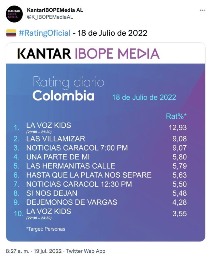 Un primer capítulo en el que se presentaron 6 niños que se robaron el corazón de los colombianos, así lo demostraron los números. De acuerdo al más reciente informe de Kantar Ibope Media, compañía encargada de medir y analizar el rating en Latinoamérica, el primer episodio de "La Voz Kids" ocupó el primer puesto en audiencia en Colombia.