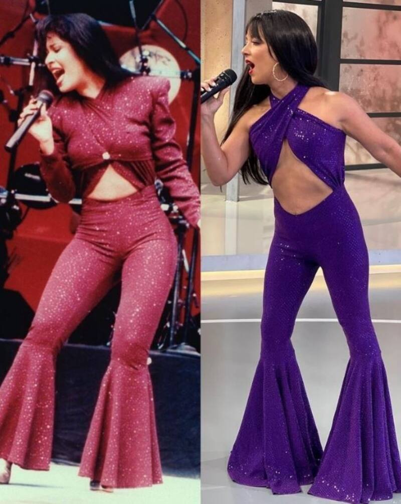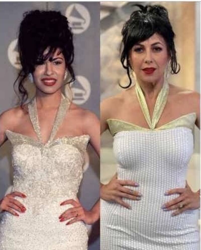 Chiquibaby lució un look diferente al de la presentadora puertorriqueña pero también característico de Selena, optó por el cabello recogidos y un vestido de lentejuelas tipo halter que la cantante de "Amor prohibido" utilizó en su pasó por los premios Grammy.