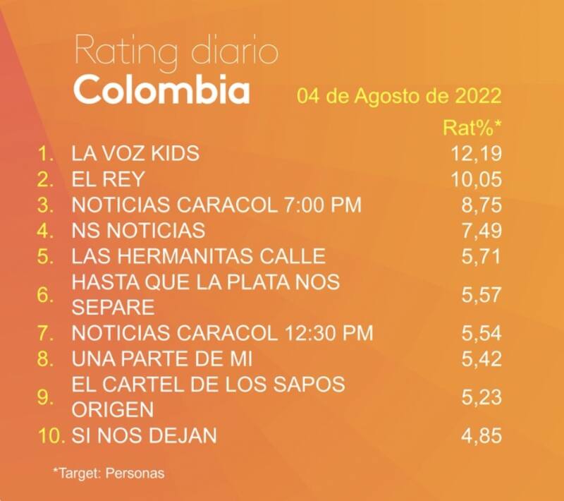 Canal Caracol sigue en el top de la pantalla colombiana con "La Voz Kids" con un 12.19% y en segundo lugar "El rey, Vicente Fernández" con un 10,05% y en tercer lugar Noticias Caracol 7:00 p.m. con un 8,75%.