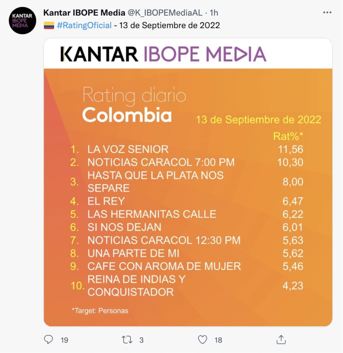 El estreno de "La Voz Senior" continúa en la misma línea que "La Voz Kids", ocupando el primer lugar de sintonía en los hogares colombianos. Con 11,56 en rating, según el informe de Kantar Ibope Media, compañía encargada de medir y analizar el rating en Latinoamérica, la producción ocupó un lugar privilegiado en su estreno.