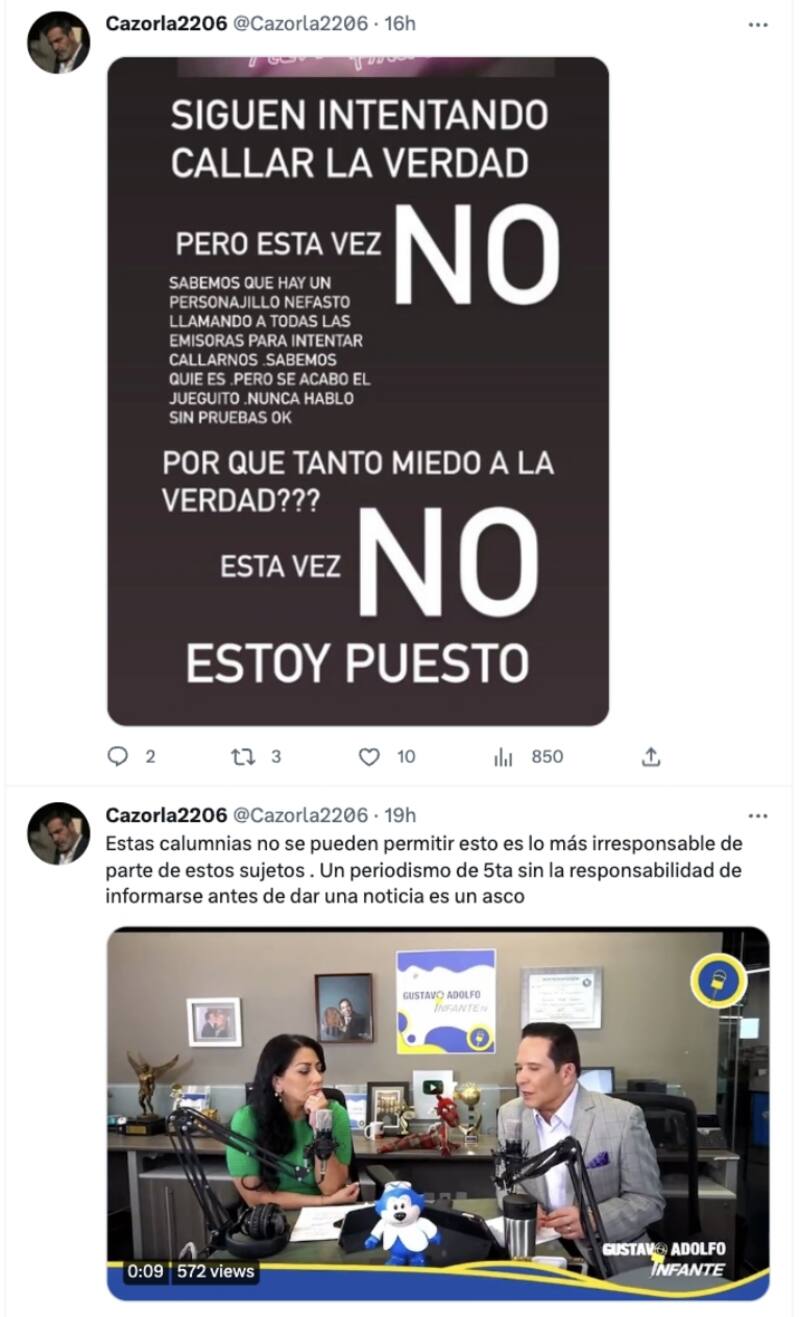 Ante esto el esposo de Mary Boquitas ha tachado las aseveraciones de Gustavo Adolfo Infante cómo "calumnias" en su cuenta de Twitter.