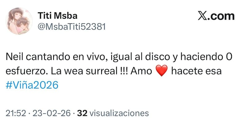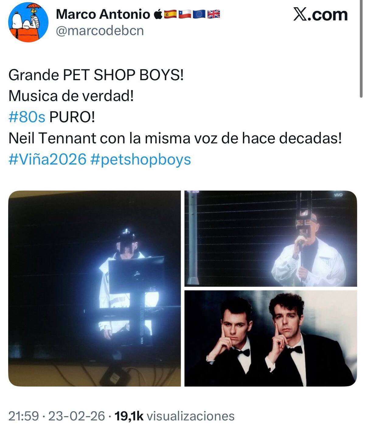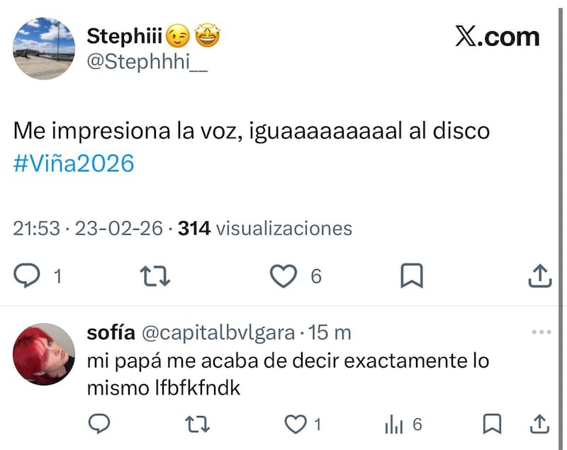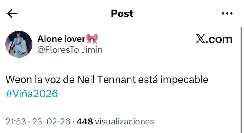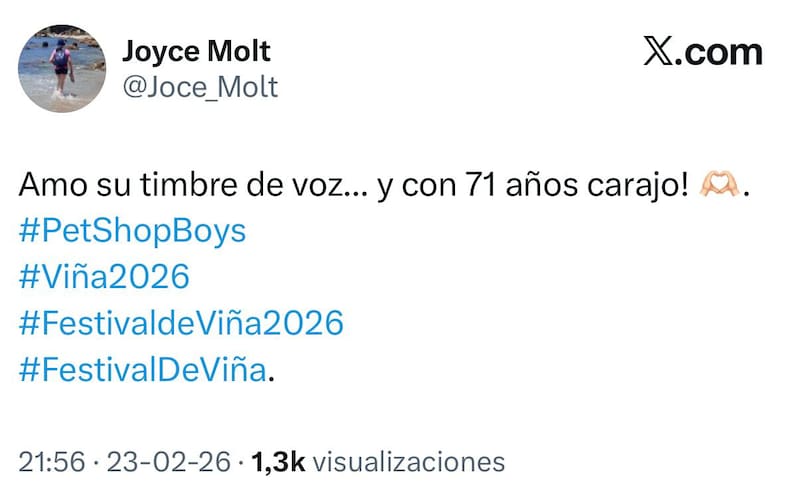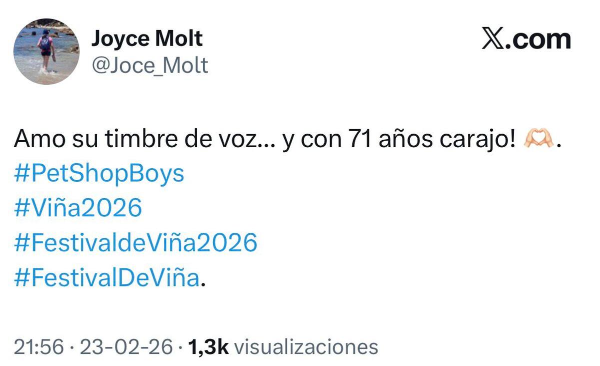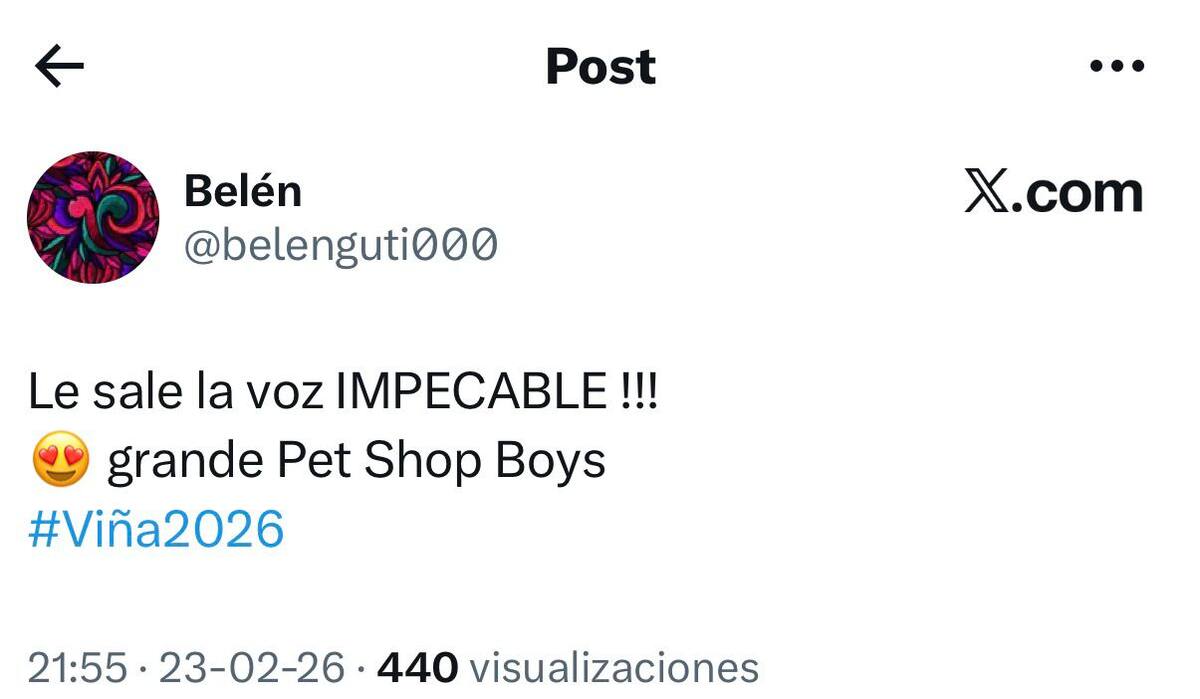 En el comienzo de la segunda noche del certamen viñamarino, la presentación de Pet Shop Boys no solo llamó la atención por su particular puesta en escena, sino también por su impecable desempeño vocal. Mientras el espectáculo aún estaba en desarrollo, usuarios en X comenzaron a coincidir en un punto: “le sale la voz impecable”.