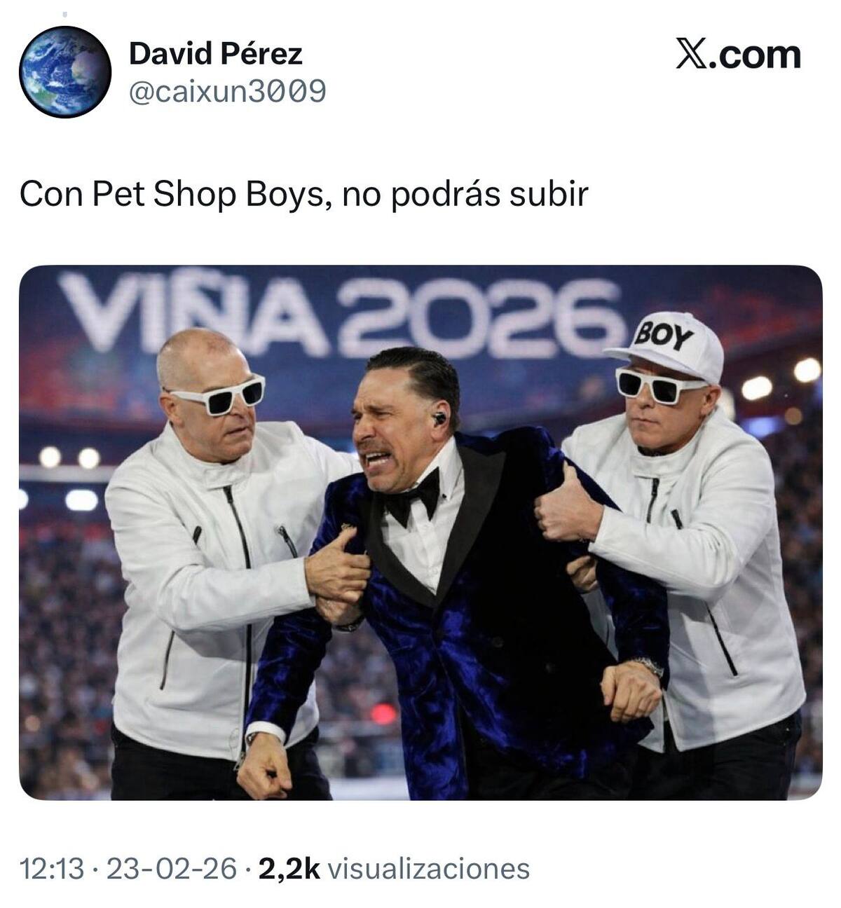 En plena segunda noche del certamen viñamarino, Pet Shop Boys se subió al escenario de la Quinta Vergara con un espectáculo inaugural que mezcló clásicos, visuales impactantes y un look que rápidamente se convirtió en tendencia. Mientras el show aún se desarrollaba, las redes sociales ya estaban inundadas de memes que reaccionaban al estilo y la estética futurista del dúo.