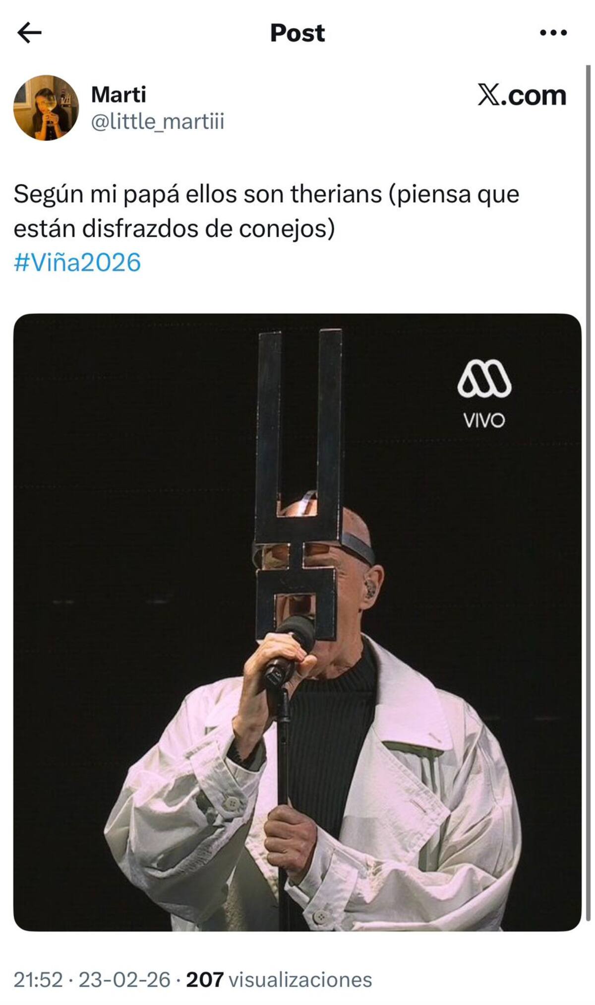 Desde comparaciones con elementos cotidianos y personajes, hasta bromas sobre su vestuario geométrico y minimalista, los usuarios no tardaron en convertir su presentación en material viral. Como ya es tradición en el Festival de Viña, el Monstruo no solo se manifiesta en la Quinta, sino también en X, donde cada detalle del espectáculo es comentado en tiempo real.