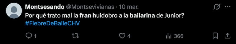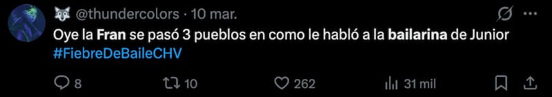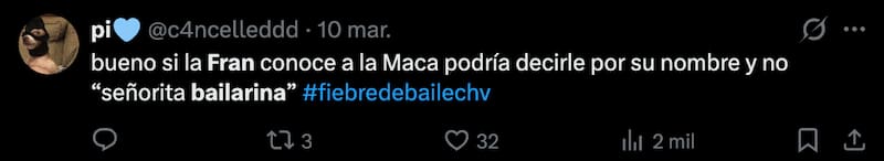 “Señorita bailarina, déjese de doblar; usted ha estado en otras temporadas conmigo y sabe que no me gusta que doblen las canciones”, le tiró Fran a Maca Muñoz con un duro tono, lo que sorprendió e incomodó a la compañera de Junior.