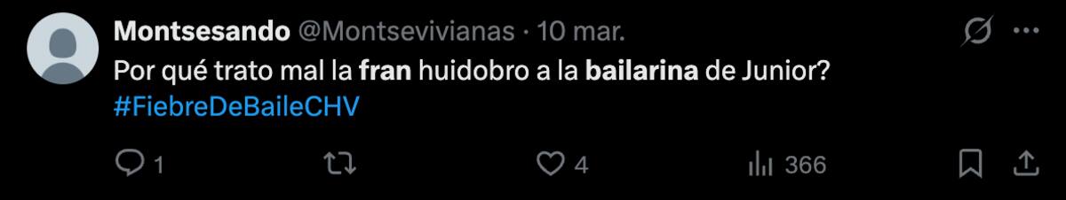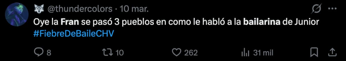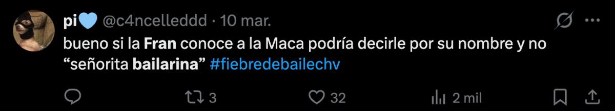“Señorita bailarina, déjese de doblar; usted ha estado en otras temporadas conmigo y sabe que no me gusta que doblen las canciones”, le tiró Fran a Maca Muñoz con un duro tono, lo que sorprendió e incomodó a la compañera de Junior.