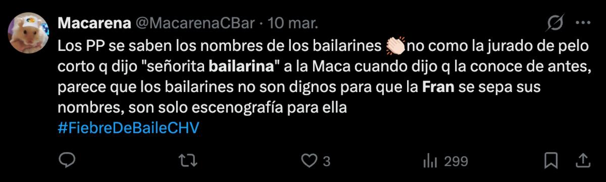 Resulta que al evaluar a Junior Playboy junto a su bailarina, Macarena Muñoz, las palabras de la “Dama de Hierro” no fueron muy amables con el exchico reality por su baja presentación. El problema fue que también le llamó la atención a Maca, con palabras que no pasaron coladas para los televidentes.