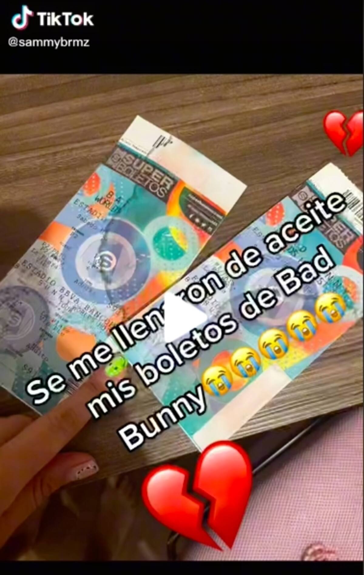 "Se me llenaron de aceite mis boletos de Bad Bunny. Se borró todo. Ni el mar está tan salado, chale", dice el texto del video el cual está leído por la famosa voz de Tiktok.