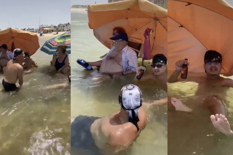"Estamos con los abuelos, la sombrilla y todo en el agua, que ya llega bastante por la rodilla", cuenta la TikToker mientras ve cómo el barco está haciendo subir un poco el oleaje mientras la silla de los abuelos tambalea por el impulso de las olas que van llegando.