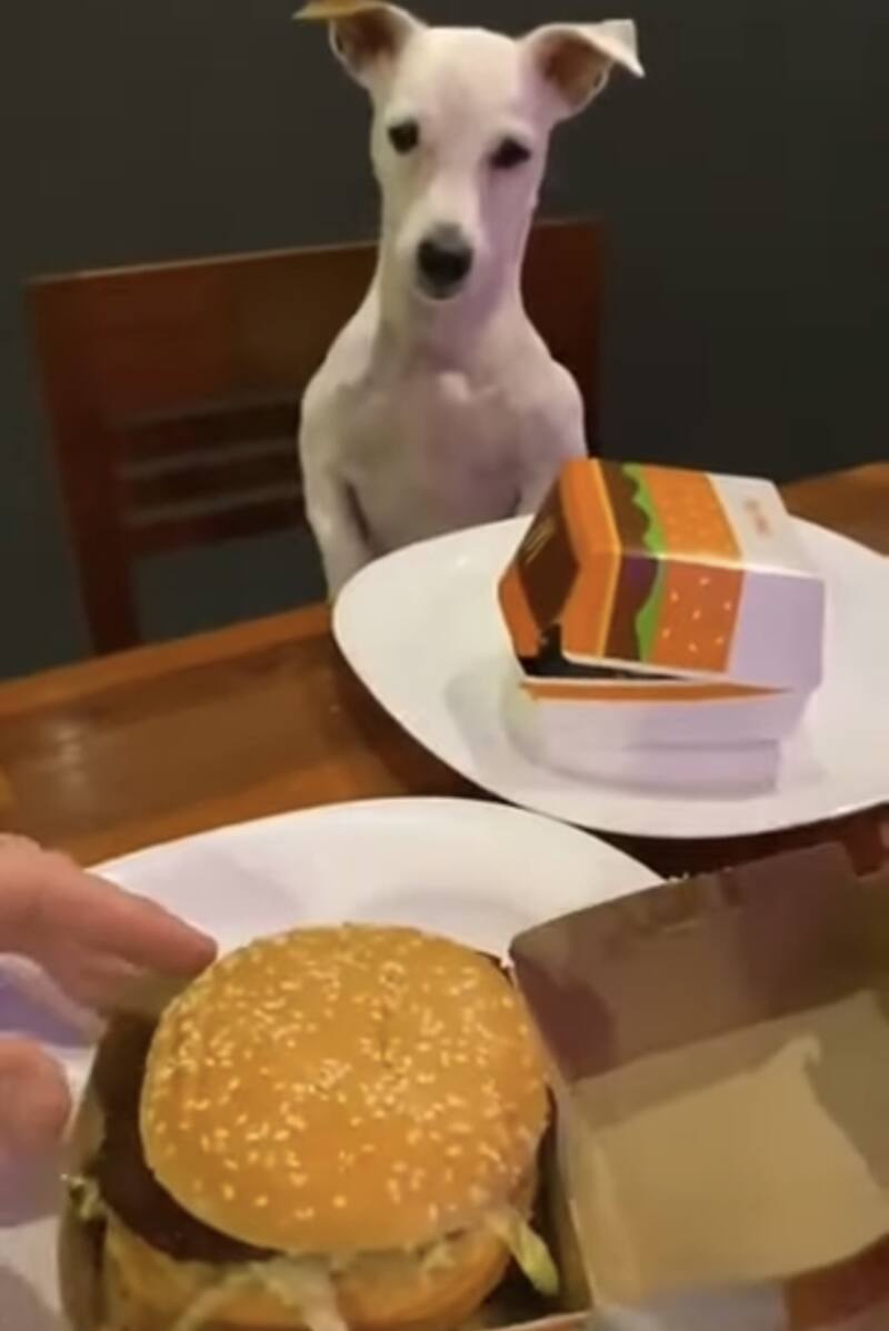 En el video que está dando la vuelta en Internet se puede ver como un hombre se sienta a almorzar con su fiel compañero. Mientras ambos están sentados en la mesa esperando a comer, el hombre abre su caja de hamburguesa primero y el perrito se saborea lo grande que es.