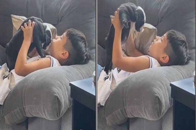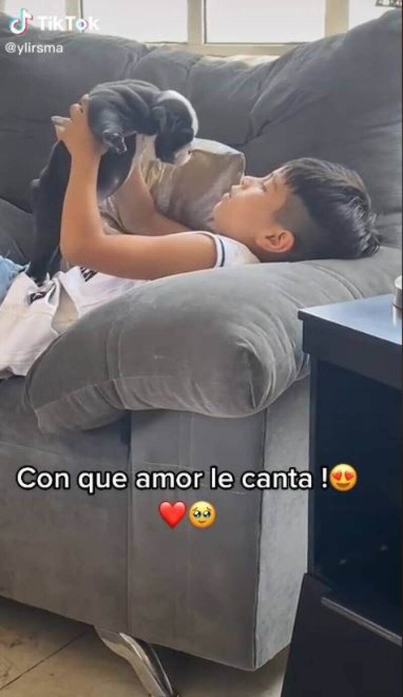 En las imágenes difundidas en TikTok se puede ver al menor recostado en un sillón que mientras suena la melodía "Tal vez" del cantante puertorriqueño Jerry Rivera, toma en sus brazos al cachorro y comienza a cantarle.