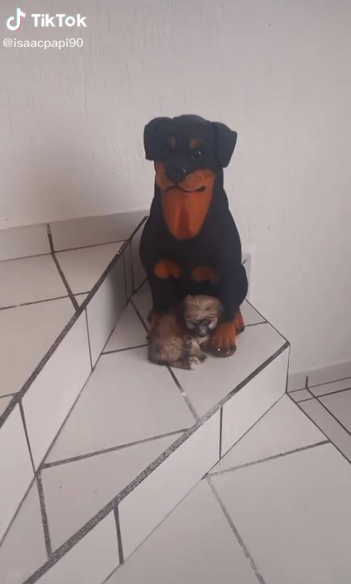 En las imágenes compartidas en la red social por el usuario @isaacpapi90 se puede ver el momento en el que el cachorro al ver la escultura de yeso en forma de un perro rottweiler se acerca a ella subiendo con dificultad las escaleras y se refugia en sus patas como buscando consuelo, tal y como lo haría con su madre.