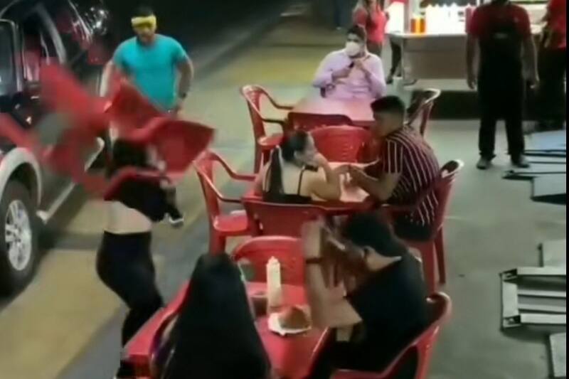 En el video que compartió, se puede apreciar el lugar en completa calma, hasta que, de un momento a otro, llega una camioneta, de la que descienden un hombre y una mujer, quien visiblemente molesta toma una silla y se la arroja a un sujeto, quien estaba acompañado de otra mujer.