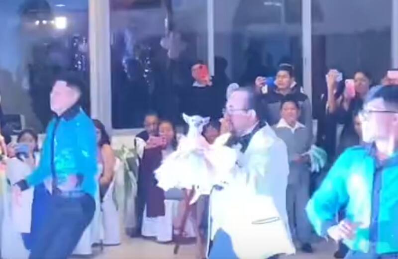 En clip, que compartió el usuario Marco Valencia, está la chihuahua en la pista de baile mientras la carga su dueño para que siga los pasos y movimientos del grupo de chambelanes que están detrás de ella.