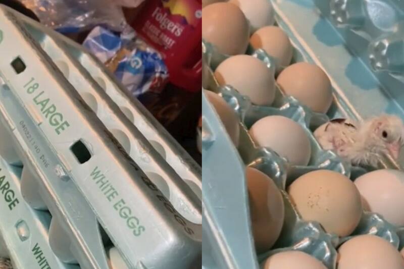 En el clip, la mujer aparece abriendo una de dos cajas de 18 huevos blancos, cuando de uno, saca la cabeza un pequeño pollito.
