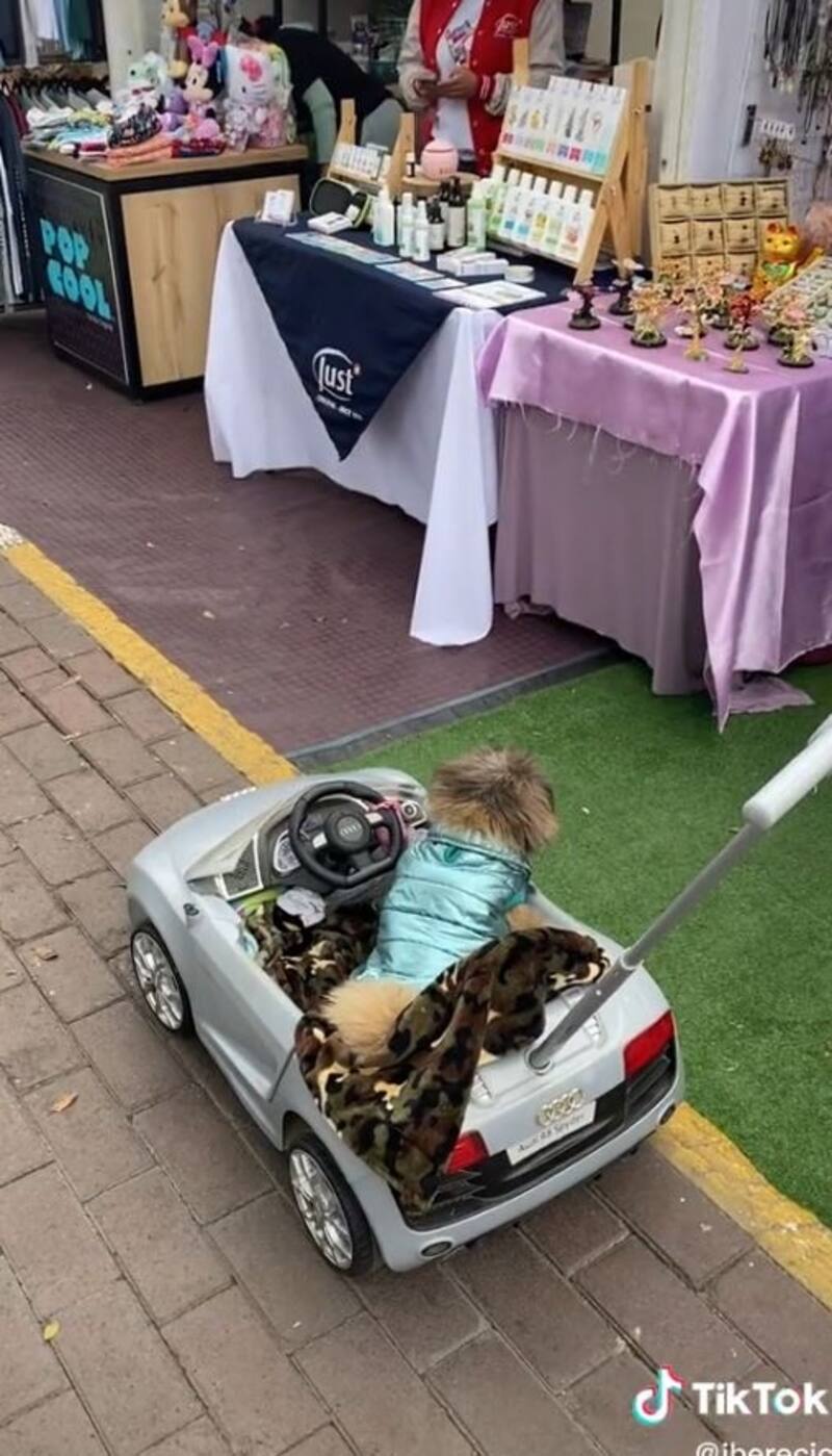 En las imágenes publicadas por la usuaria @iberecic se puede ver al can montado en un lujoso mini Audi R8. La adorable mascota luce un chaleco en color azul metálico que llama la atención a su paso.
