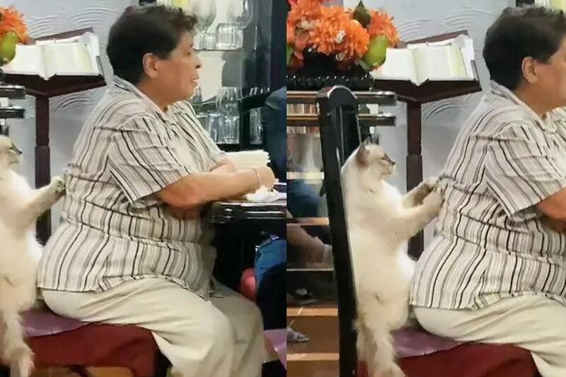El pequeño michi es grabado de pie, recargado sobre el respaldo de silla y usando sus patas delanteras para tocar la espalda de lo que parece ser la abuela de la familia.
